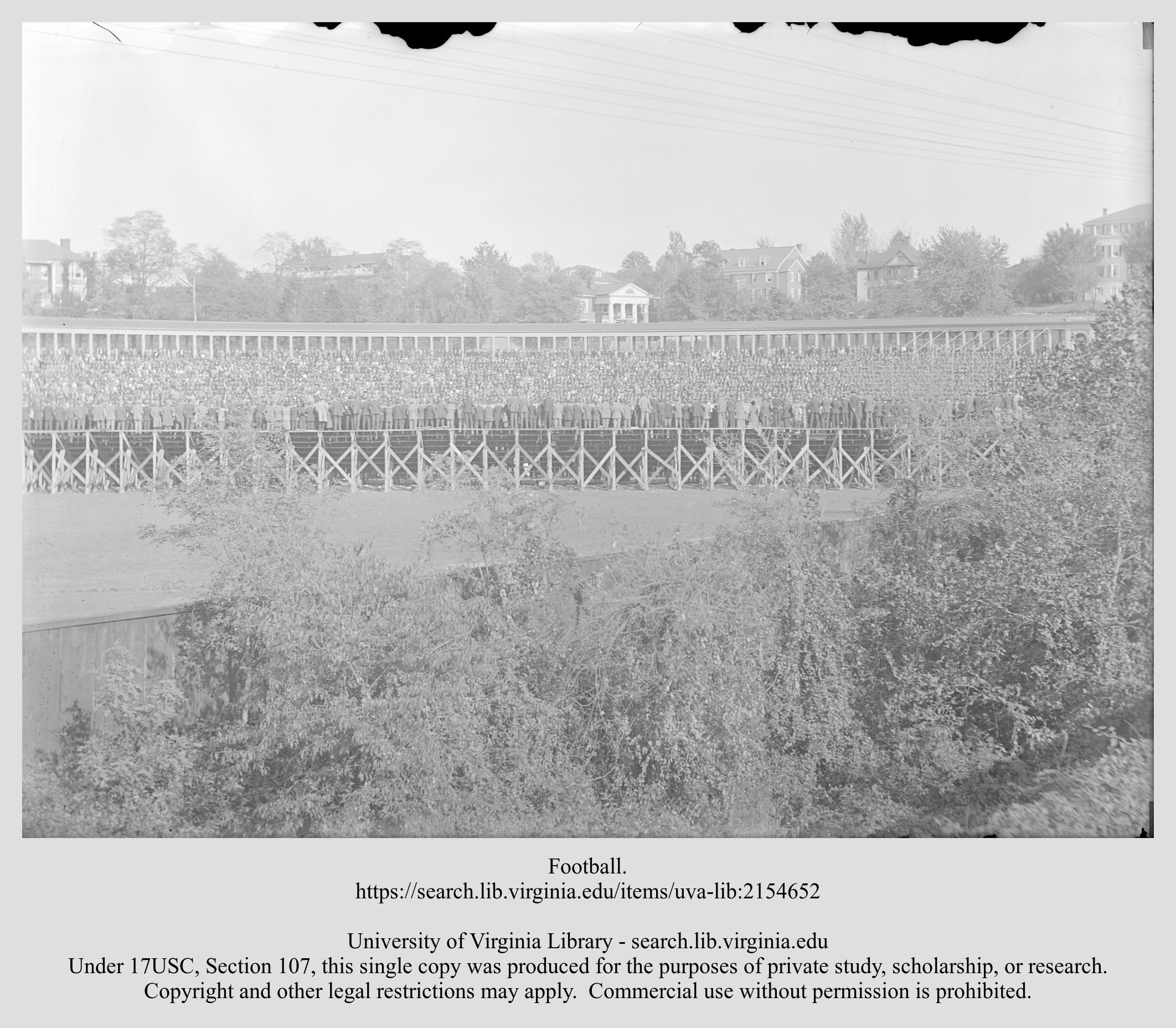 Few major improvements were made to the field after that. A scoreboard was added for the first time in 1921, and in 1928 a new one was added at the south side of the field. Temporary seats were added periodically as needed, with seating swelling to over 20,000 for particularly well-sold games. Permanent seating, however, remained limited to the concrete quarter-bowl on the northeast side of the stadium, which became particularly problematic after demand for Cavalier home games grew following a 1919 decision forbidding the football team from playing at neutral sites. Varsity football left for Scott Stadium part-way through the 1931 season [11].
